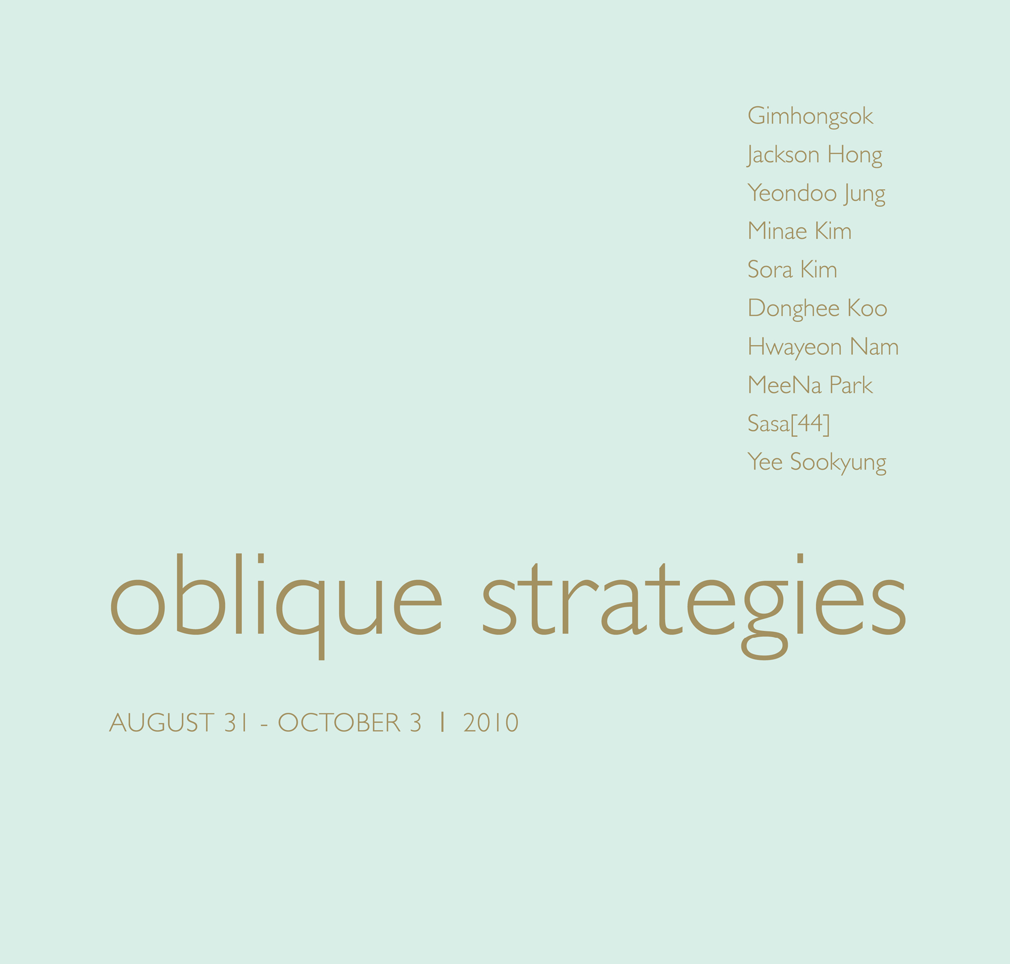 2010 Tricksters Tricked, Van Abbemuseum, Eindhoven, The Netherlands Trust: Media City Seoul 2010, Seoul Museum of Art, Seoul, Korea Memories of the Future, Leeum Samsung Museum of Art, Seoul, Korea Oblique Strategies, Kukje Gallery, Seoul, Korea Aichi Triennale 2010: Arts and Cities, Aichi Arts Center, Nagoya, Japan Asian Arts Collection, Contemporary Art Museum, Kumamoto CAMK, Kumamoto, Japan Media Art from NMCA Collection , National Museum of Contemporary Art, Seoul, Korea Linguistic Morphology: Art in Context, Sungkok Art Museum, Seoul, Korea Day of Confidence, Alternative Space Pool, Seoul, Korea
